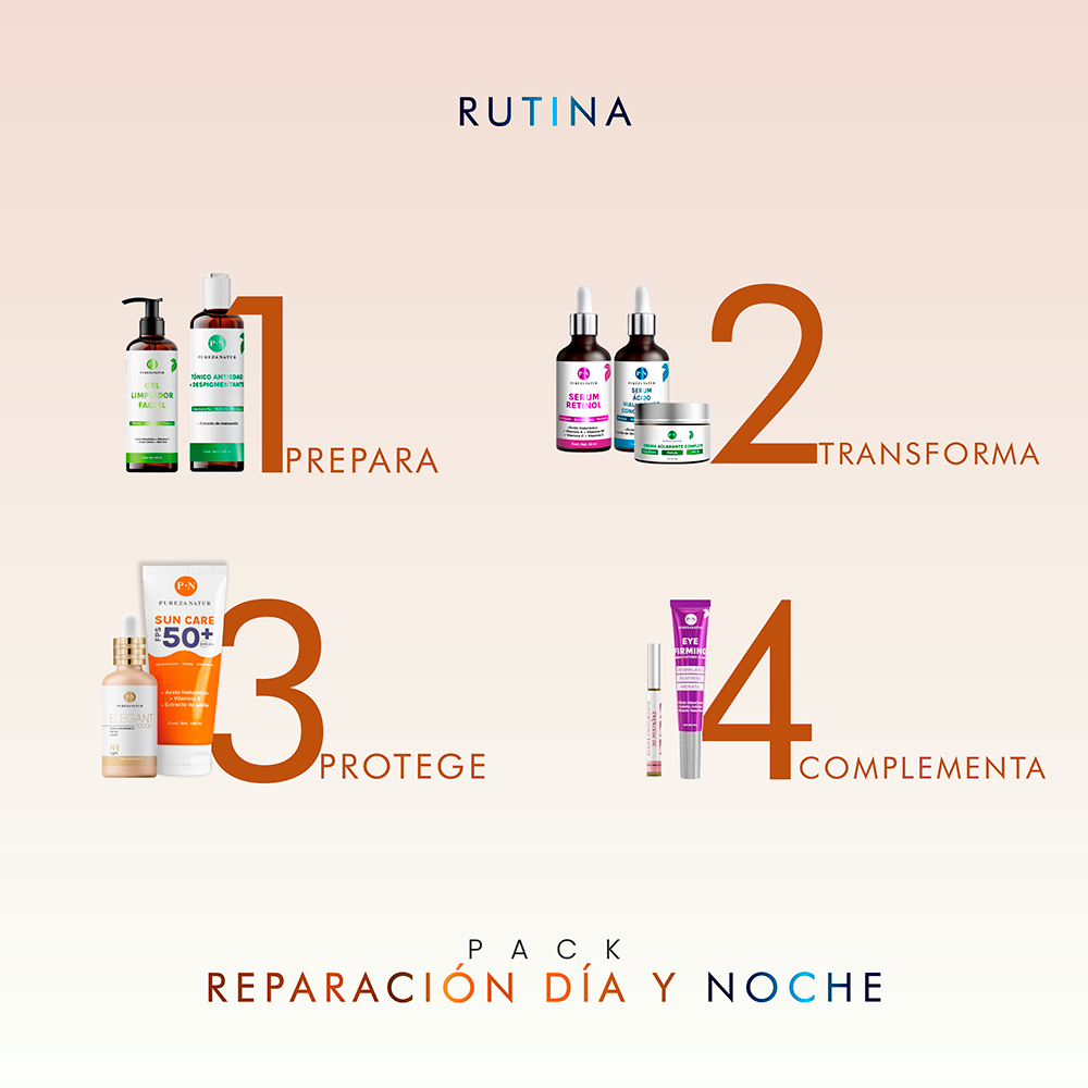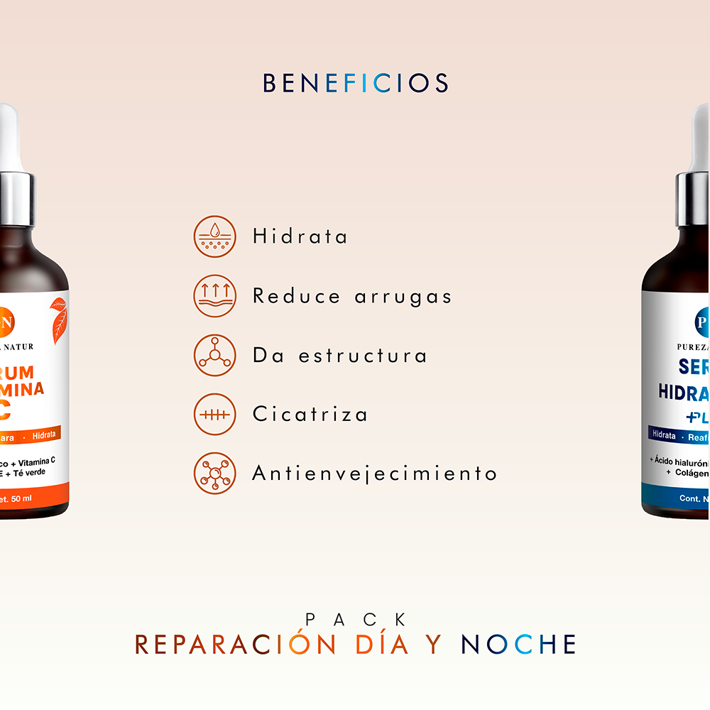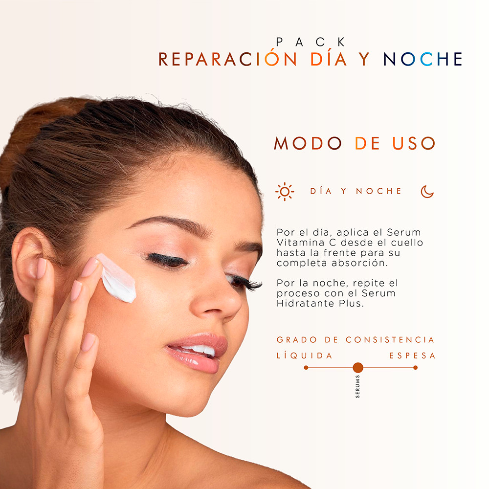 Una rutina de reparación día y noche. Por la mañana, la Vitamina C protege y revitaliza la piel con su poder antioxidante. Por la noche, el Serum Hidratante Plus repara y restaura su elasticidad a través de una hidratación profunda. El resultado es una piel más firme, luminosa y visiblemente rejuvenecida. Ideal para todo tipo de piel.
