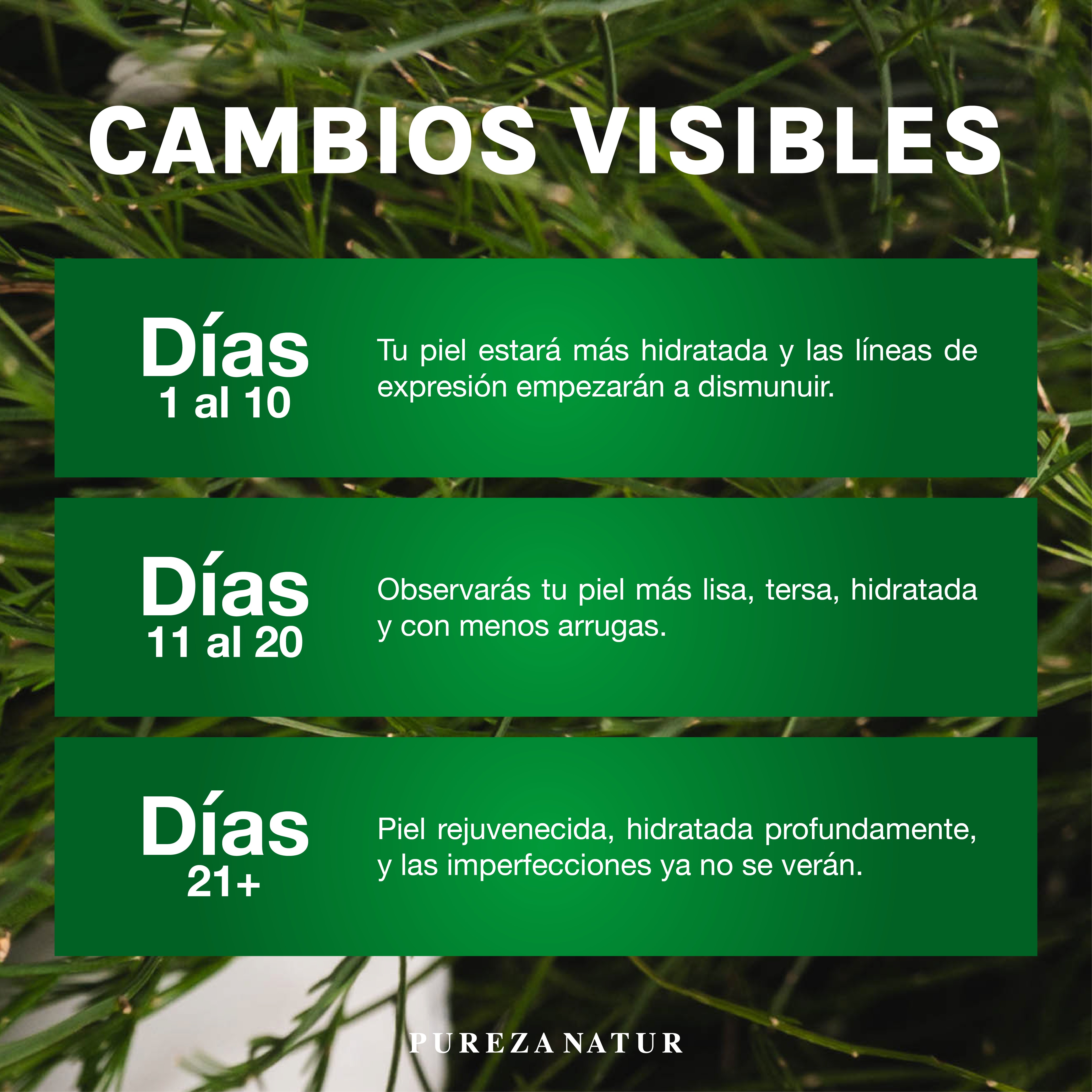 Día 30-45: Piel rejuvenecida, hidratada a profundidad, las imperfecciones ya no se ven.