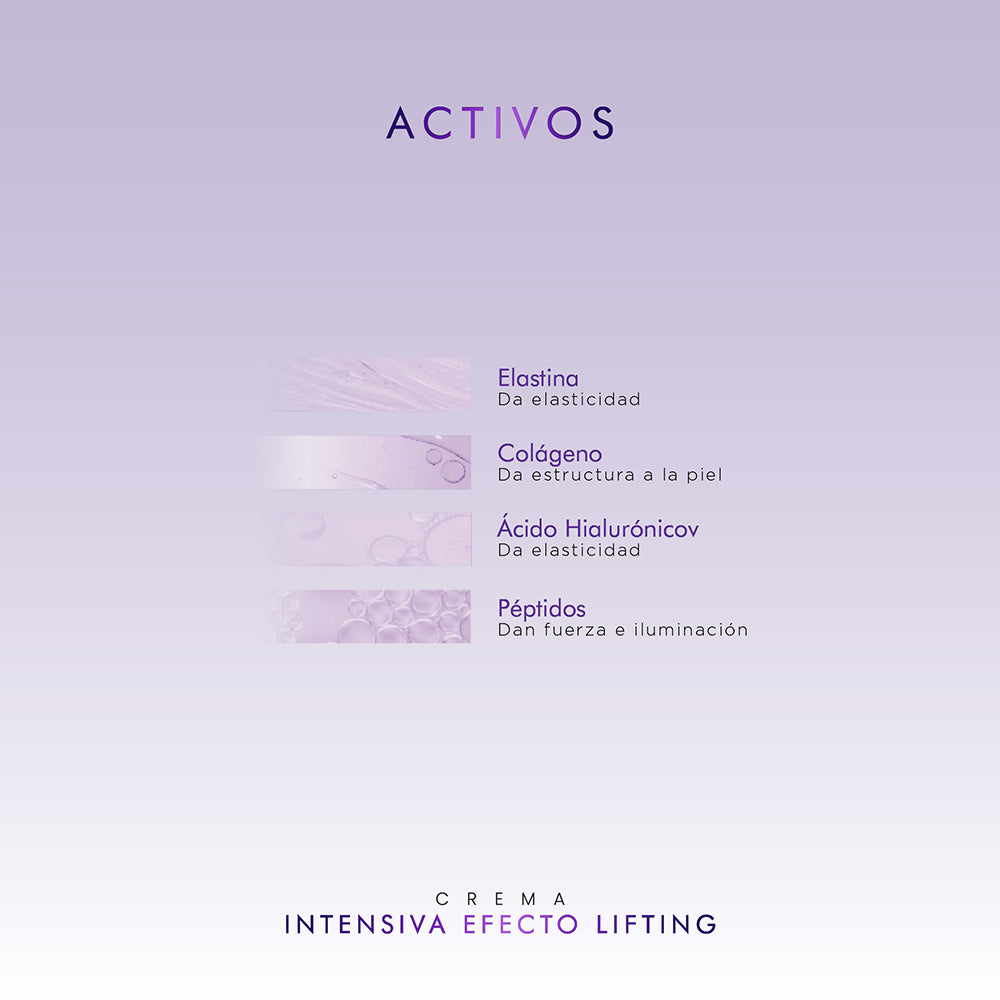 Péptidos: Son proteínas que dan fuerza para que la piel se vea iluminada y estirada. Colágeno: Da estructura a la piel, y hace que se vea más lisa.