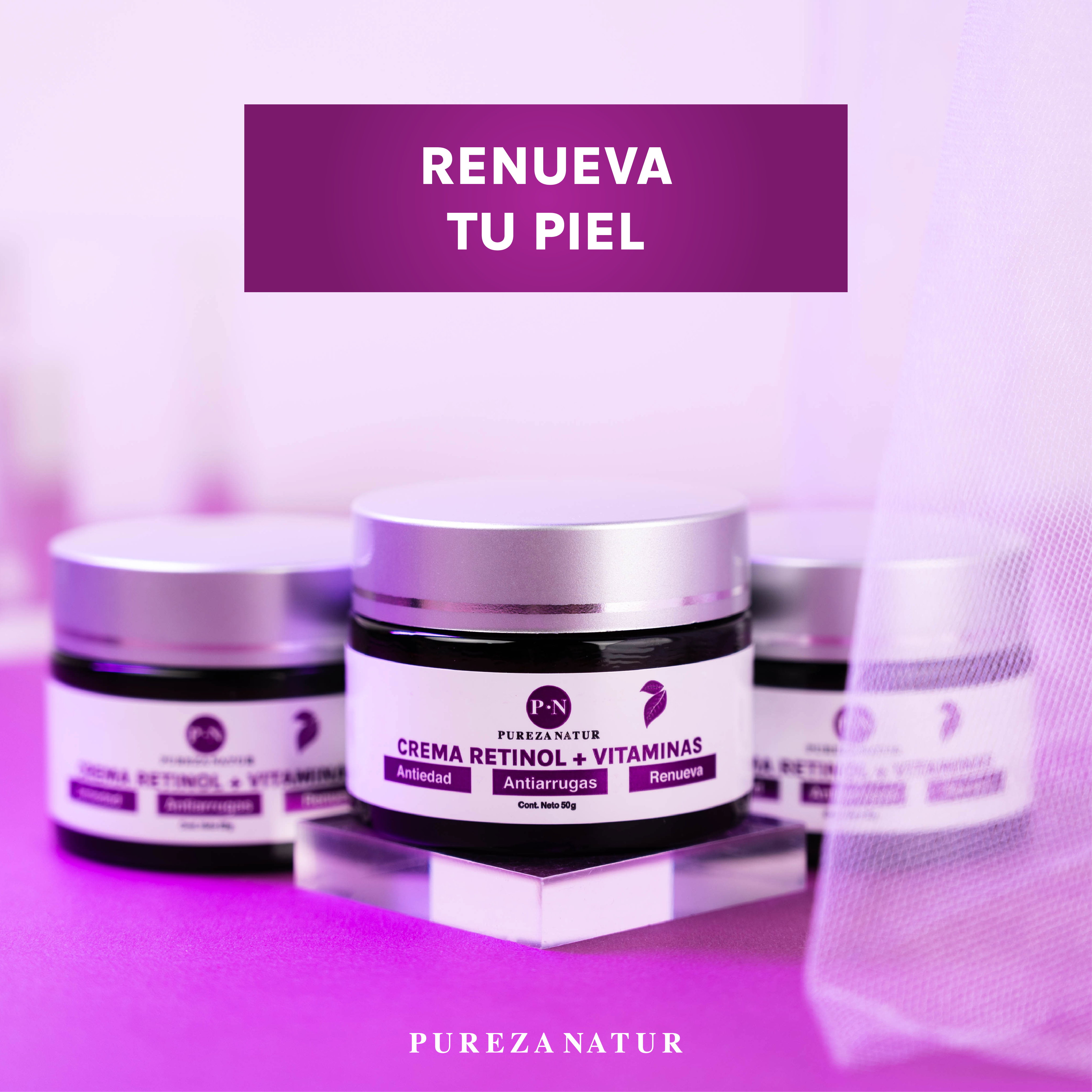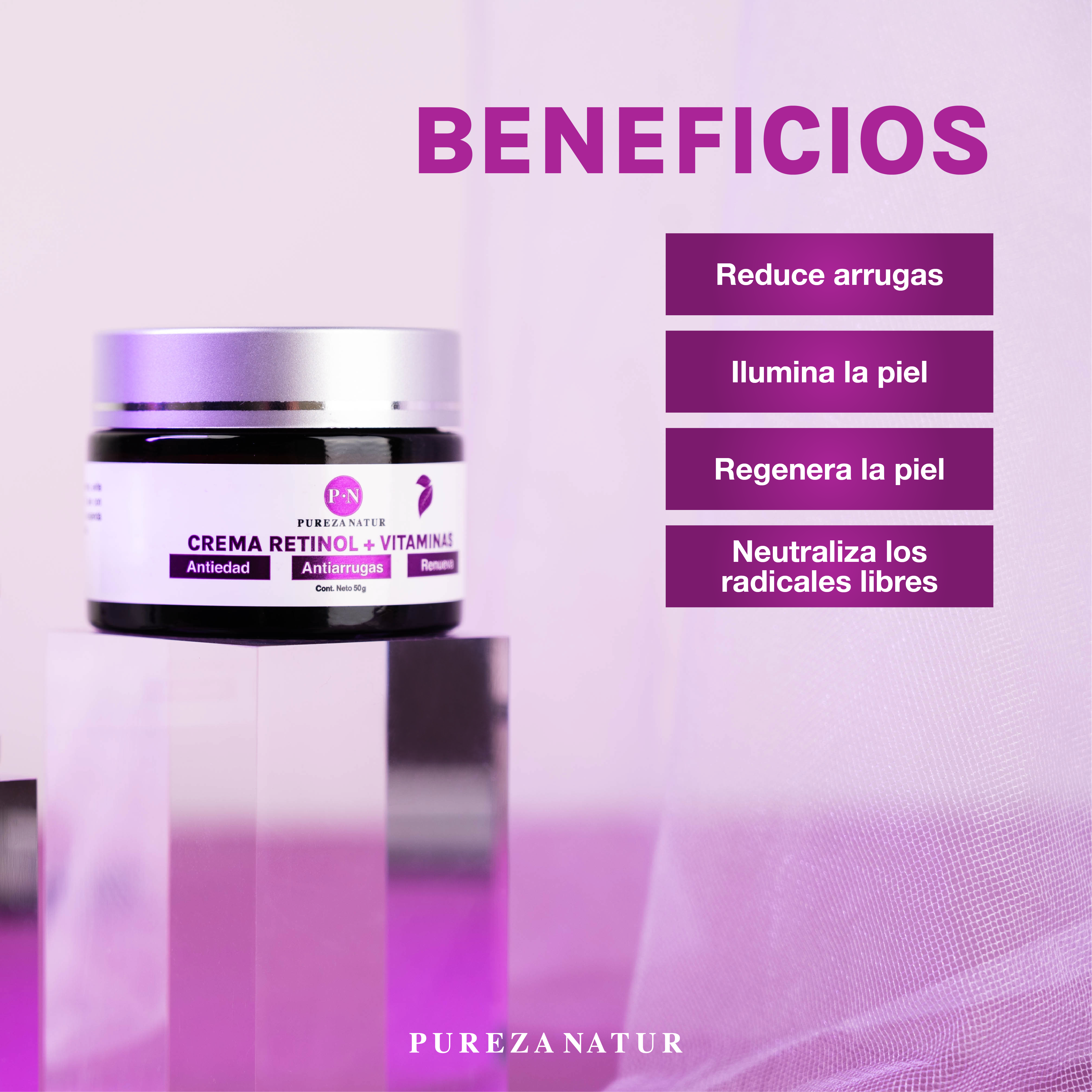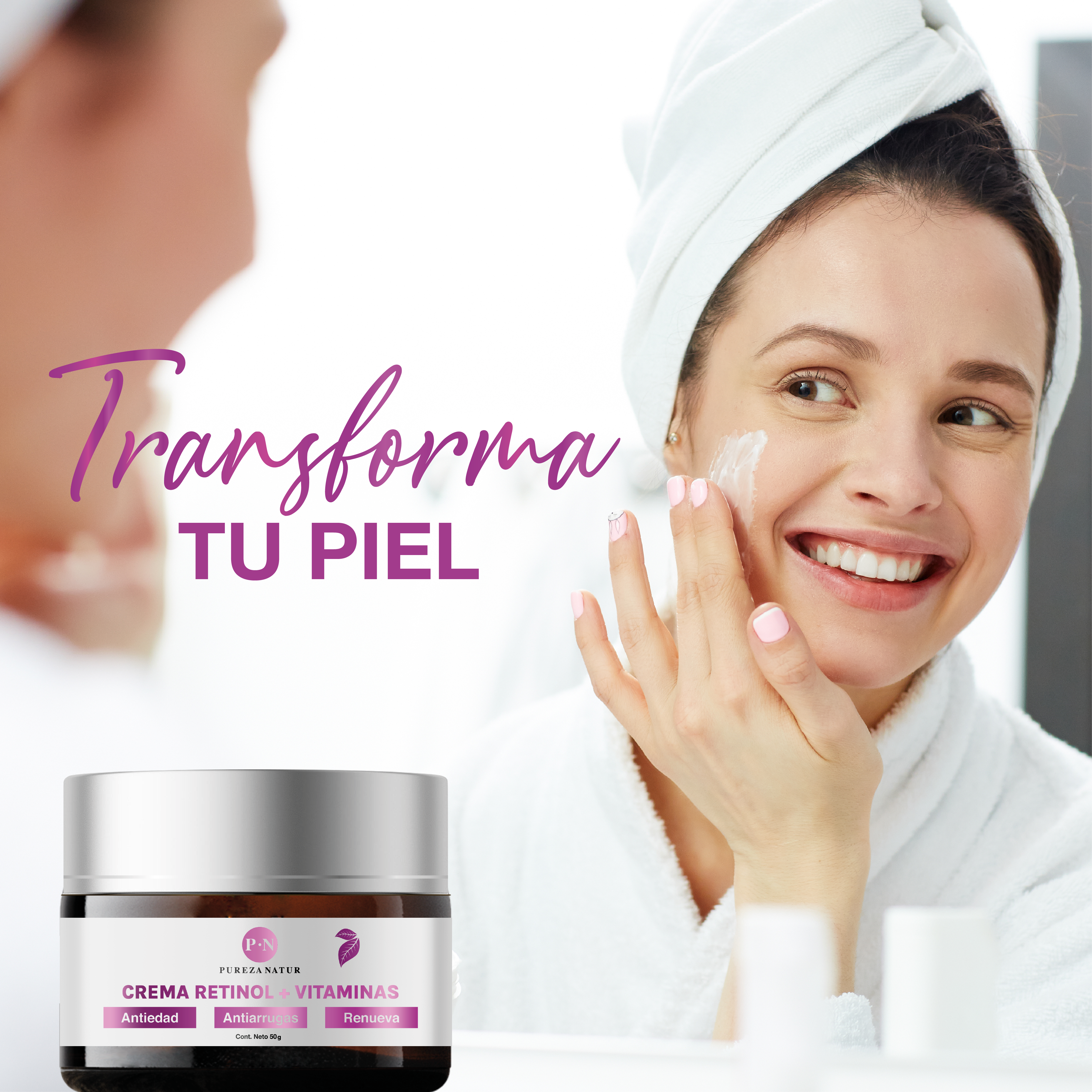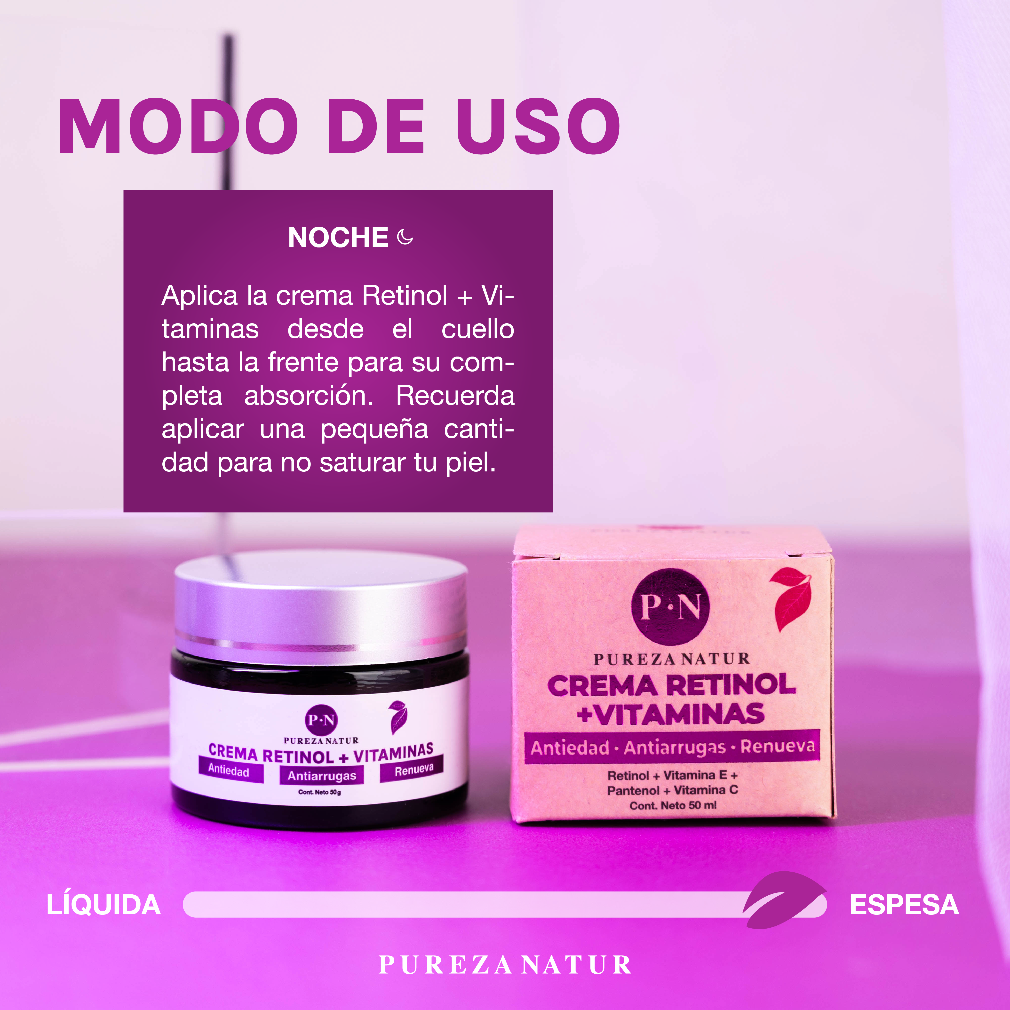 La Crema Retinol + Vitaminas nutre intensamente la piel, renovando su textura y suavidad. Su formulación avanzada desvanece arrugas finas y gruesas, mientras hidrata y estimula la producción de colágeno y elastina, brindando vitalidad y retrasando el envejecimiento.