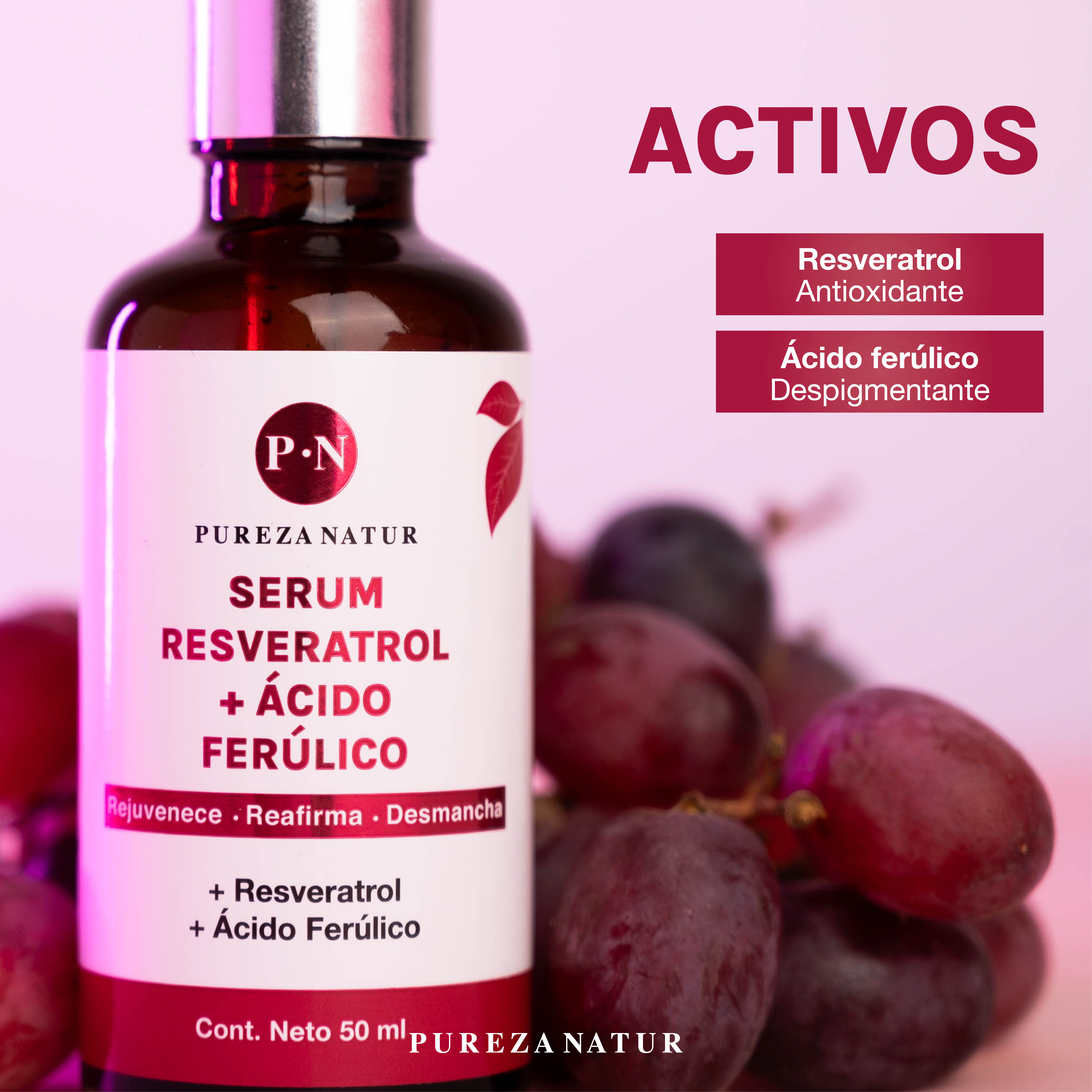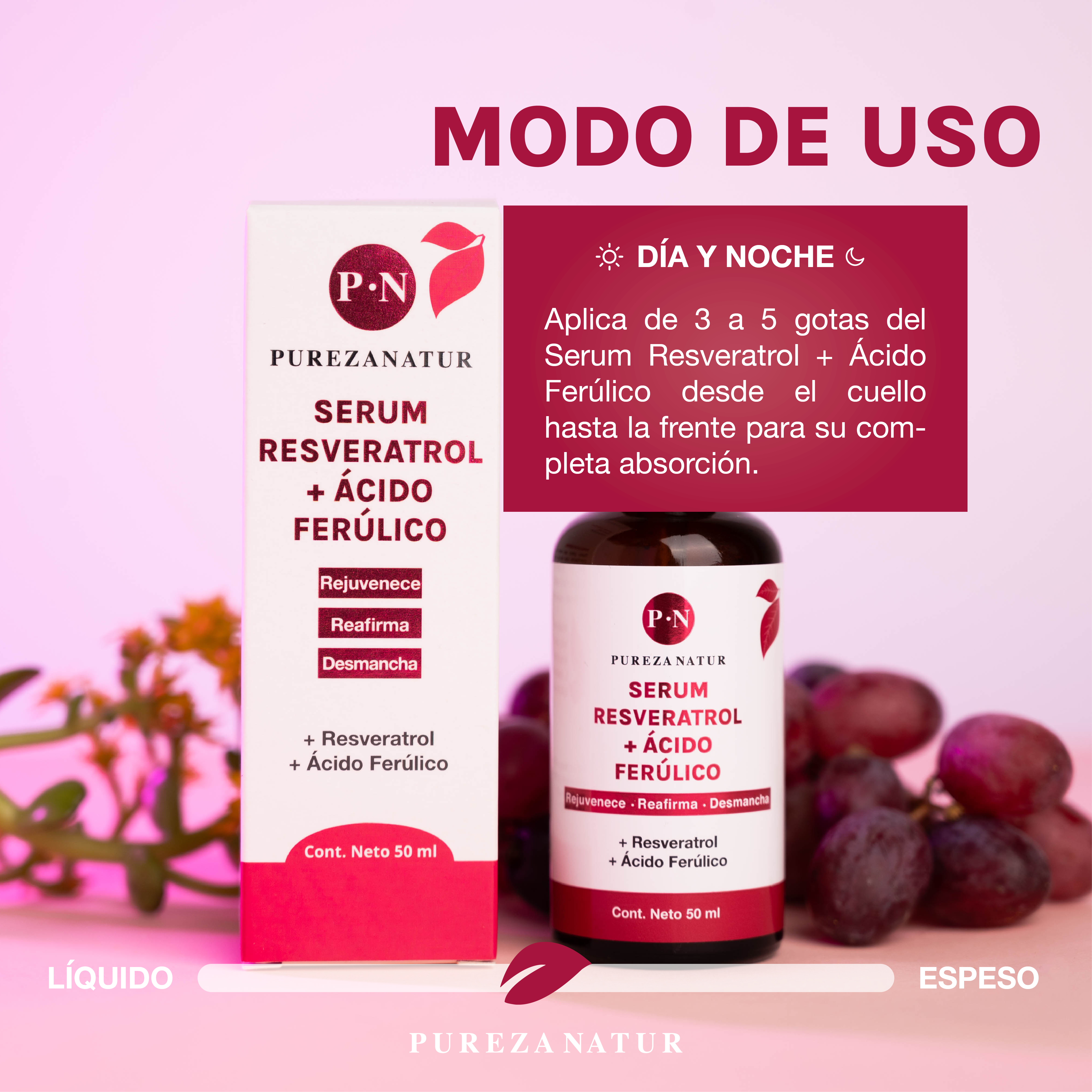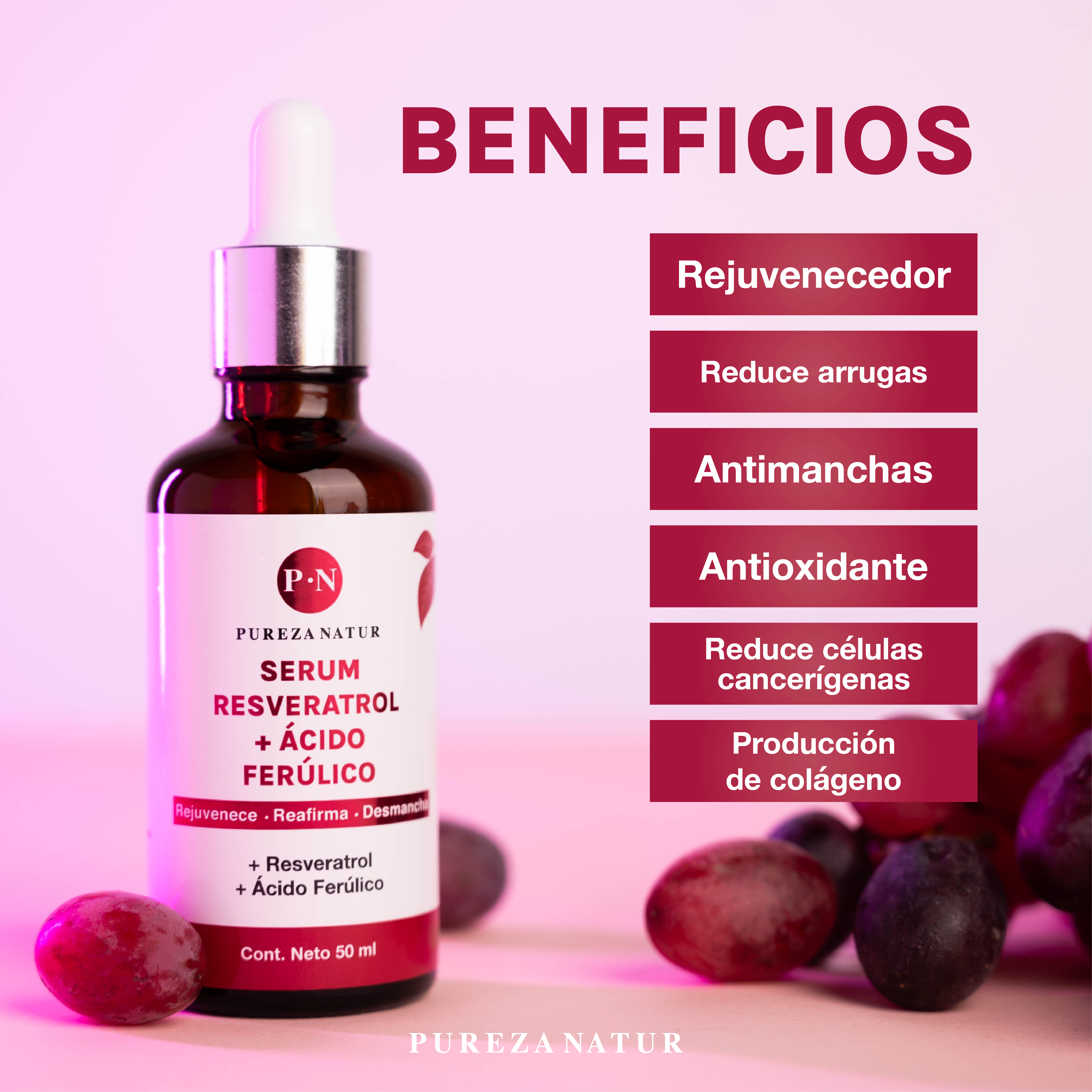 Serum formulado con resveratrol, el antioxidante más potente para la piel, el cual, previene el envejecimiento prematuro. Ayuda a la regeneración de la piel, reduce arrugas y líneas de expresión. Reduce manchas ocasionadas por la luz UV.